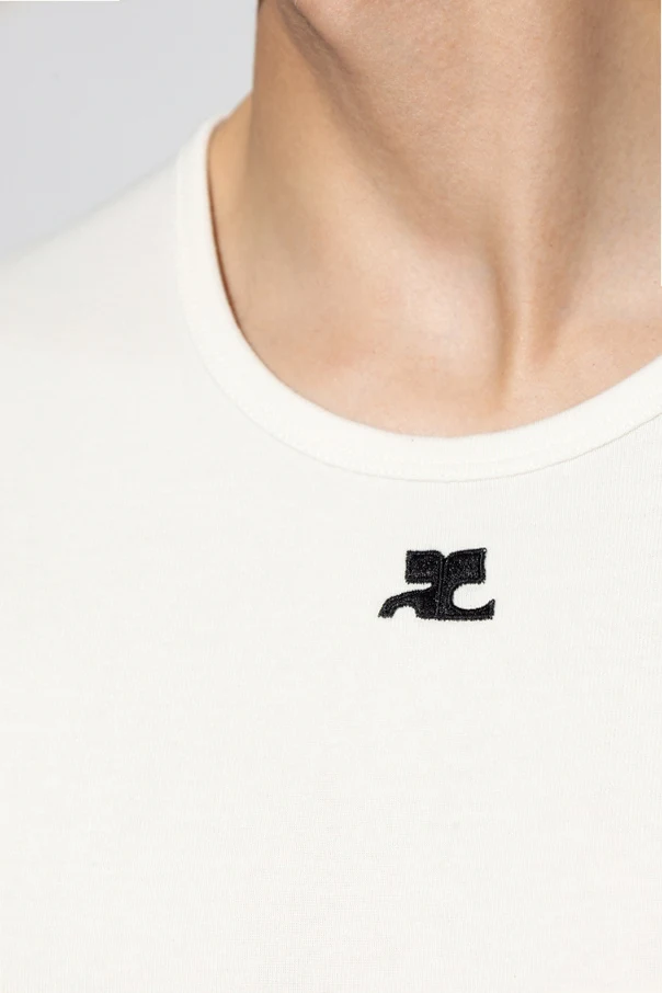 Kremowa, miękka bawełna zachwyca delikatnością i lekkością, oferując wyjątkowy komfort noszenia. Jedyną ozdobę stanowi dyskretnie haftowane, czarne logo umieszczone tuż pod dekoltem, subtelnie podkreślając ekskluzywny charakter produktu i świadcząc o przynależności do światowej klasy marki Courrèges. Pozbawiony zbędnych elementów, zachwyca czystą formą oraz perfekcyjną jakością wykonania.