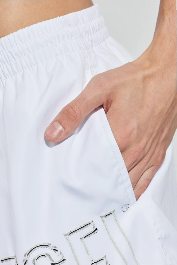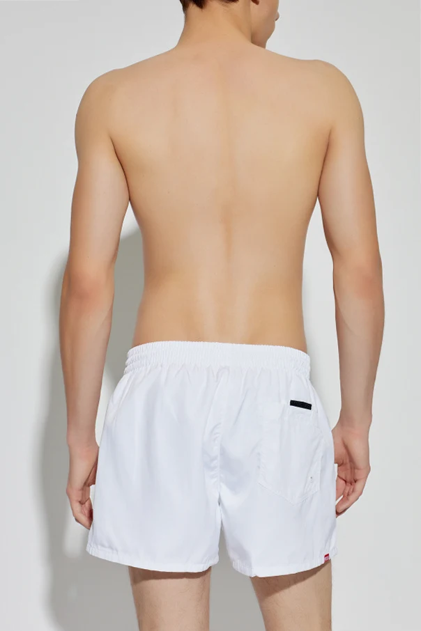 Gładka, biała tkanina techniczna zachwyca szlachetną prostotą i funkcjonalnością — szorty są szybkoschnące, a ich elastyczny pas z czarnym troczkiem umożliwia precyzyjną regulację. Wyraziste, duże logo DIESEL na przedniej części lewej nogawki oraz subtelny label na tyle podkreślają ekskluzywny charakter produktu.