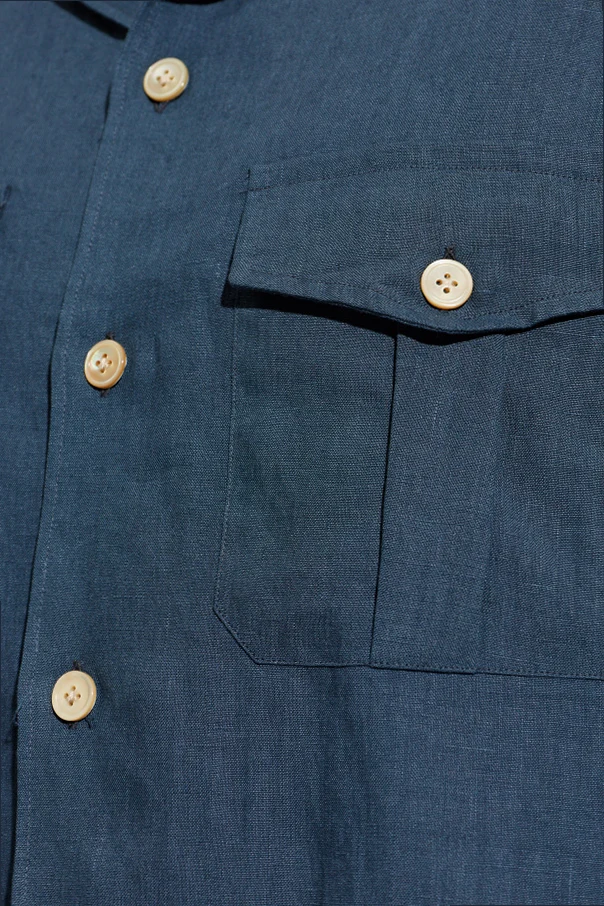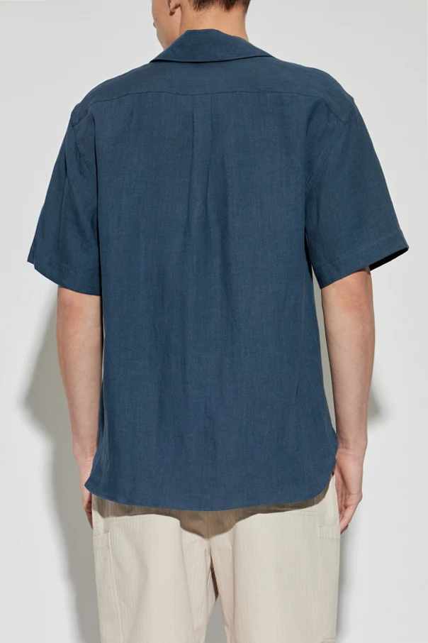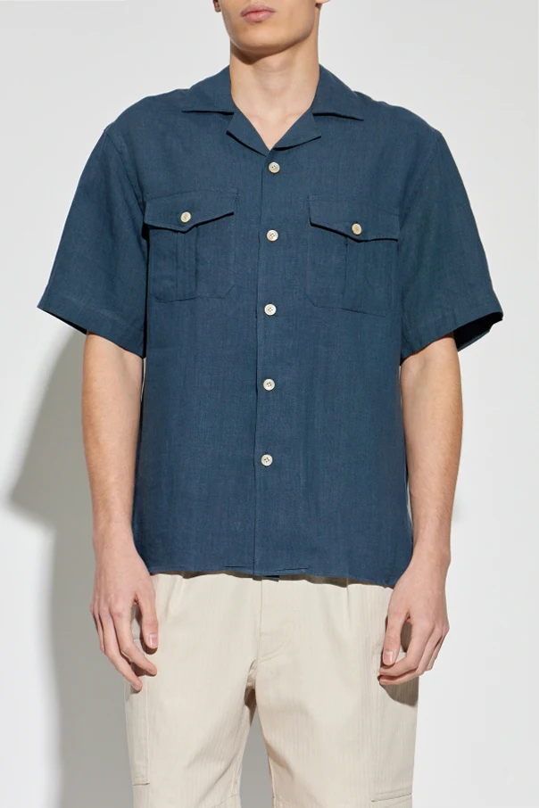 Klasyczny, luźny krój uzupełnia prosty dół oraz krótkie rękawy, podkreślając swobodę i ponadczasowy urok. Wyraziste, szerokie wyłogi kołnierza typu „camp collar” wprowadzają nonszalancką nutę oraz wyjątkową funkcjonalność. Kieszenie na piersi z patkami, zapinane na kontrastujące guziki, stanowią praktyczny oraz stylowy akcent, wzmacniając unikatowy charakter koszuli.