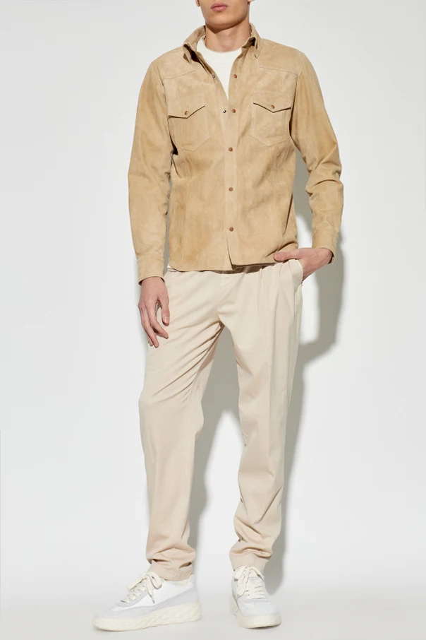 Zamszowa koszula marki Eleventy to uosobienie wyrafinowanej elegancji, skierowanej do koneserów wyszukanych form i materiałów. Starannie skrojony, klasyczny fason subtelnie podkreśla sylwetkę, a długie rękawy zakończone mankietami na guziki dodają całości wyważonej powagi.