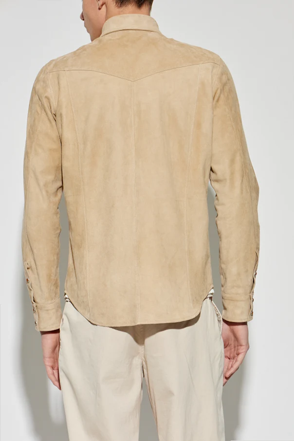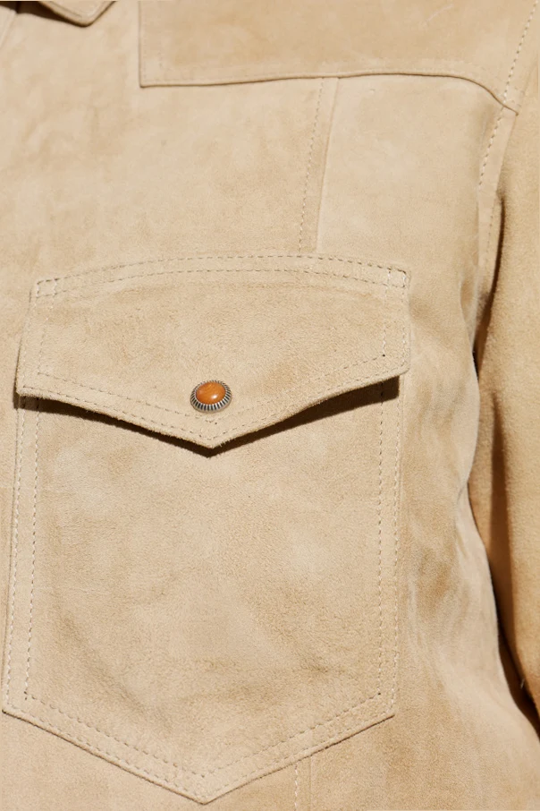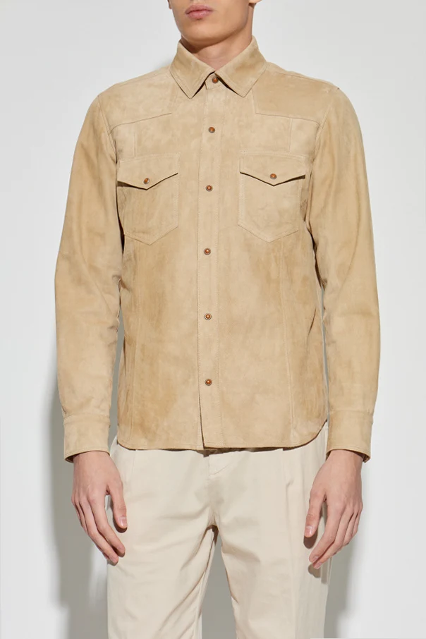 Niezwykła miękkość skóry jagnięcej zachwyca delikatnie meszkowatą strukturą, typową dla najwyższej jakości zamszu. Kremowy kolor w połączeniu z kontrastującymi, ciemniejszymi guzikami nadaje koszuli niepowtarzalnego uroku. Dwie symetryczne kieszenie z patkami na piersi oraz wyraziste przeszycia potwierdzają dbałość o detale.