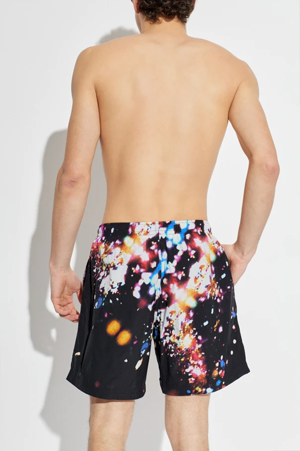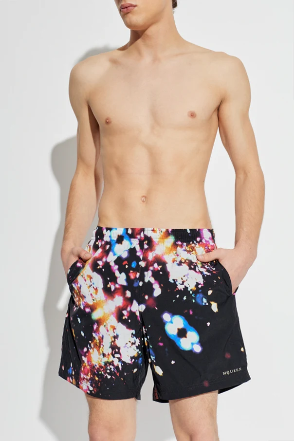 Szorty kąpielowe z logo marki Alexander McQueen to kwintesencja wyrafinowanego stylu i nowoczesnego charakteru. Ich klasyczny, lekko luźny krój sięgający przed kolano zapewnia doskonałą swobodę ruchów. Zachwycają dynamicznym, wielobarwnym wzorem inspirowanym rozbłyskami światła oraz konfetti, z wyrazistymi akcentami bieli, różu, żółci i niebieskiego, które efektownie kontrastują z czarnym tłem.
