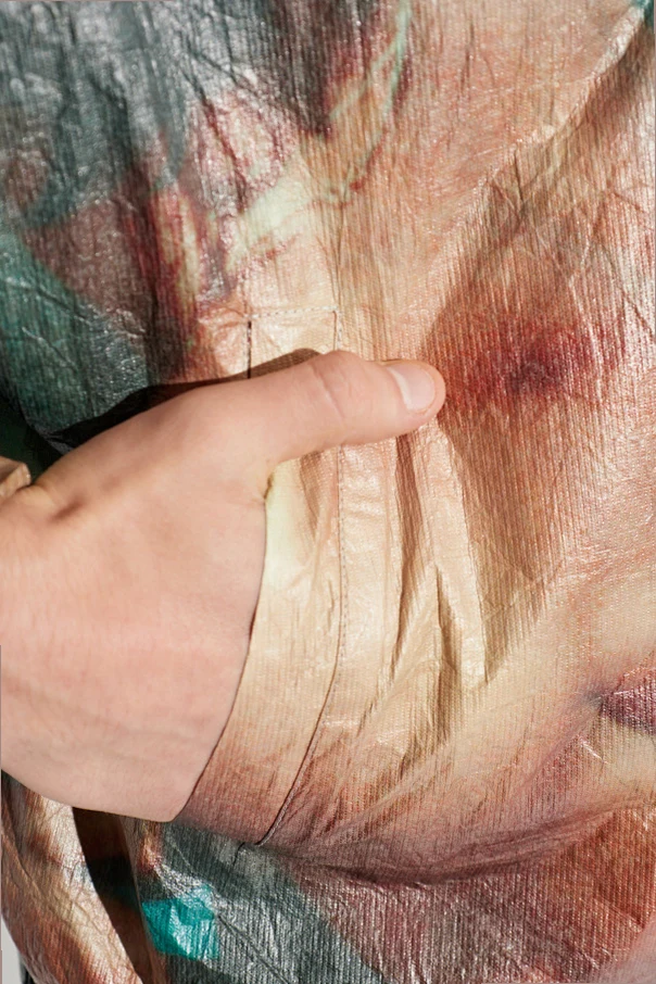 Całość utrzymana w intrygującym wzorze, gdzie artystycznie rozmyte odcienie beżu, brązu, turkusu i niebieskiego tworzą wyrazisty, multikolorowy nadruk fotograficzny. Materiał o lekko marszczonej, błyszczącej fakturze z subtelnym efektem „papierowym” dodaje kurtce szlachetności i niepowtarzalnego charakteru.