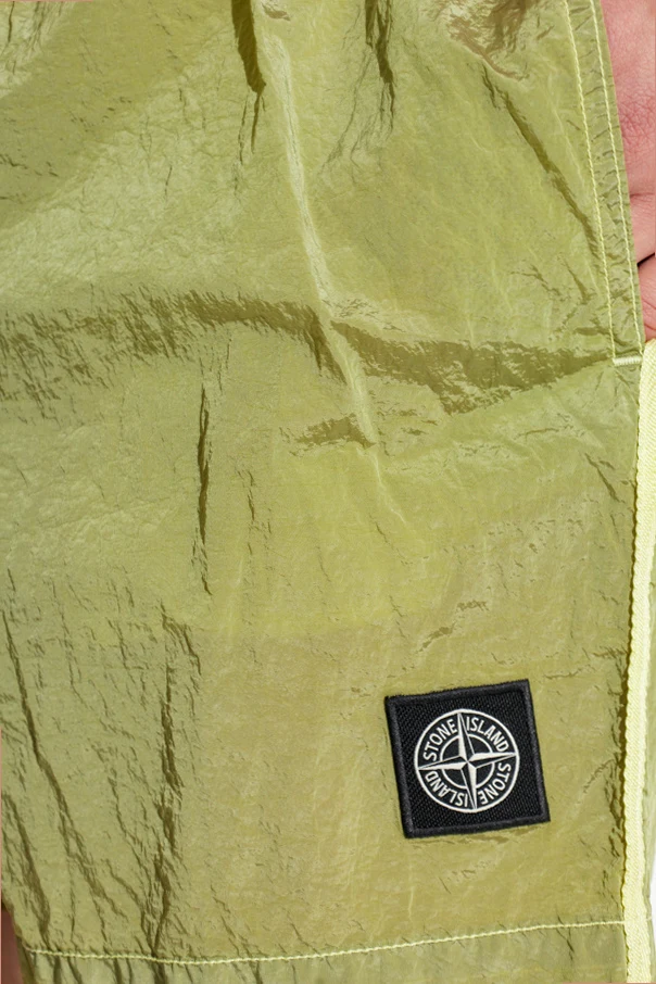 Materiał to lekki, lekko połyskujący poliamid , szybkoschnący i odporny na działanie wody, którego wyraźna faktura podkreśla ekskluzywność produktu. Całość utrzymana jest w minimalistycznej estetyce, jedynym akcentem jest naszywka projektanta w formie czarno-białego emblematu na lewej nogawce – wyraz tradycji innowacyjności marki Stone Island, legendarnej z badań nad tekstyliami.