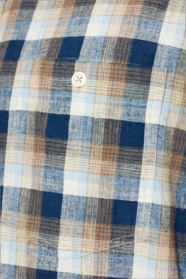 Koszula ‘Younes’ to definicja wyrafinowanej prostoty i ponadczasowego stylu. Wyróżnia się klasycznym fasonem z długimi rękawami, prostym kołnierzykiem oraz zapięciem na guziki, które subtelnie kontrastują z elegancką tkaniną. Dominujący granatowy kolor układa się w regularną, wyrazistą kratę z akcentami jasnego błękitu, beżu i śmietankowej bieli, nadając całości szlachetnej głębi. Starannie dobrana mieszanka lnu i bawełny tworzy tkaninę o delikatnym splocie i półmatowej, przewiewnej strukturze, zapewniając ponadprzeciętny komfort noszenia. Brak wyrazistych logotypów sprawia, że koszula nabiera subtelności, a kunszt widoczny jest w każdym detalu.