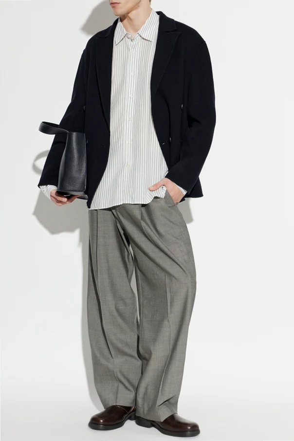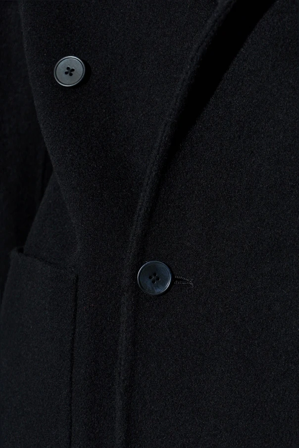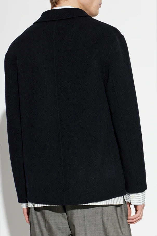 Dwurzędowe zapięcie na cztery granatowe guziki oraz dwie obszerne kieszenie naszywane z przodu subtelnie akcentują formalny charakter, jednocześnie zapewniając funkcjonalność bez kompromisów dotyczących estetyki. Brak widocznych logotypów skupia uwagę na szlachetności materiału i perfekcyjnej konstrukcji.