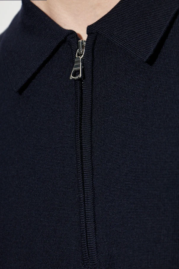 Kardigan wyróżnia się klasyczną, lekko luźną sylwetką z długimi rękawami oraz tradycyjnym kołnierzykiem. Minimalistyczny charakter podkreśla brak wzorów i zewnętrznego logo. Charakterystycznym detalem jest wyrazisty, centralnie umieszczony metalowy zamek błyskawiczny. Szerokie ściągacze na rękawach i u dołu swetra akcentują jakość wykończenia i wygodę użytkowania.