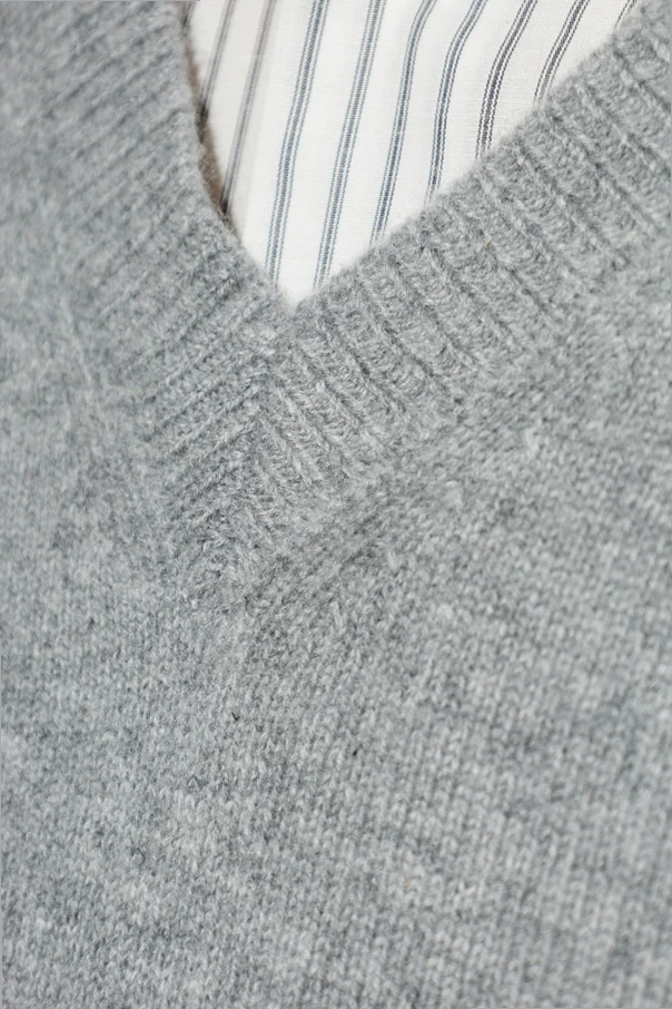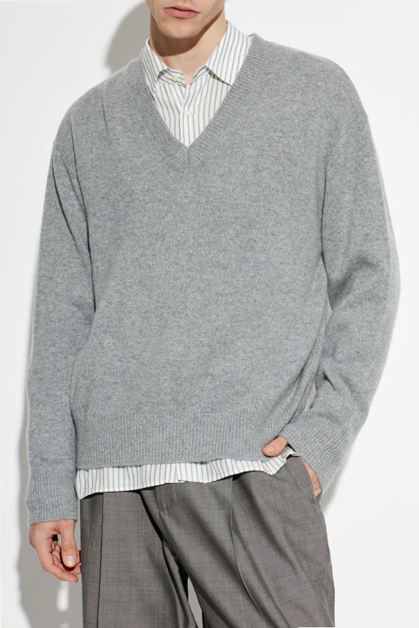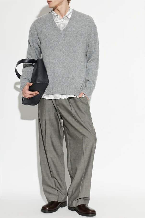 Klasyczny, prosty fason zachwyca lekko luźnym krojem, a prążkowane ściągacze przy rękawach i dole nadają całości harmonii. Wyraźny dekolt w kształcie litery „V”, ozdobiony misternym prążkowaniem, podkreśla rzemieślniczą precyzję wykonania. Brak widocznych zdobień i logotypów czyni sweter ponadczasowym i uniwersalnym.
