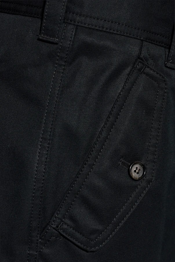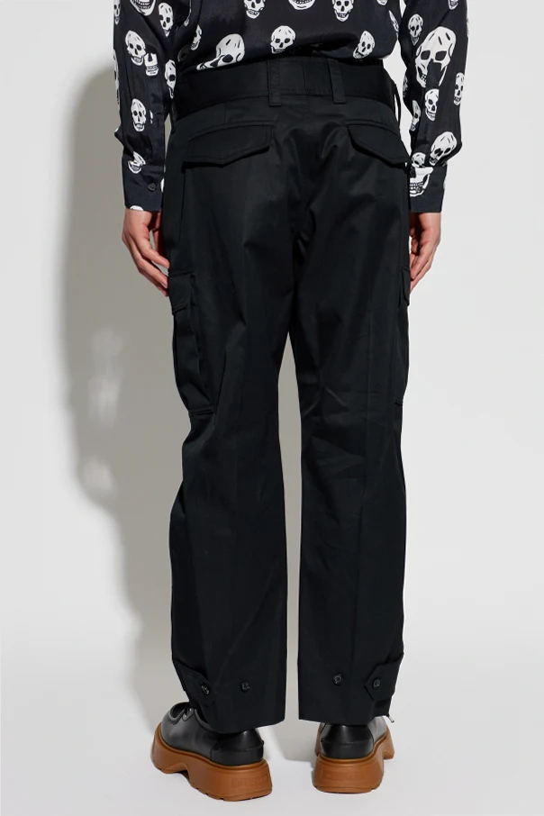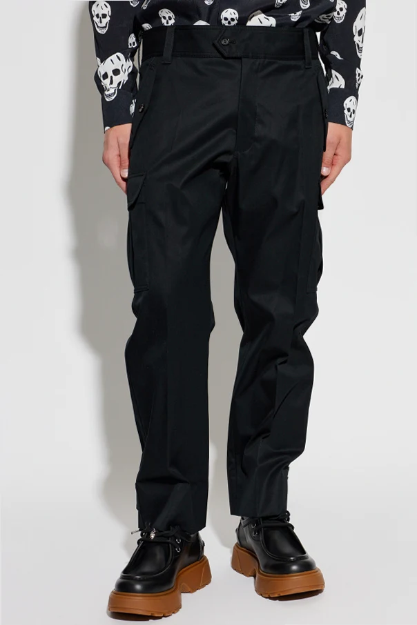Spodnie typu cargo projektu Alexander McQueen stanowią kwintesencję nowoczesnej elegancji oraz niezobowiązującej funkcjonalności. Ich klasyczny krój o prostych, luźnych nogawkach, wykonanych z wysokogatunkowej, matowej bawełny , harmonijnie łączy walory użytkowe z wysmakowaną prostotą formy. Czarna kolorystyka podkreśla ponadczasowy charakter całości, doskonale wpisując się w kanony wyrafinowanego ubioru codziennego.