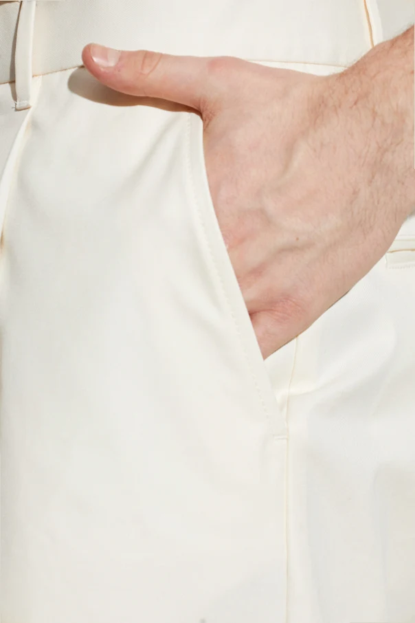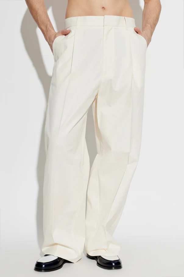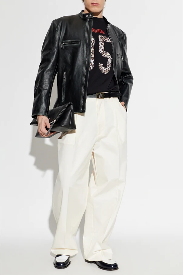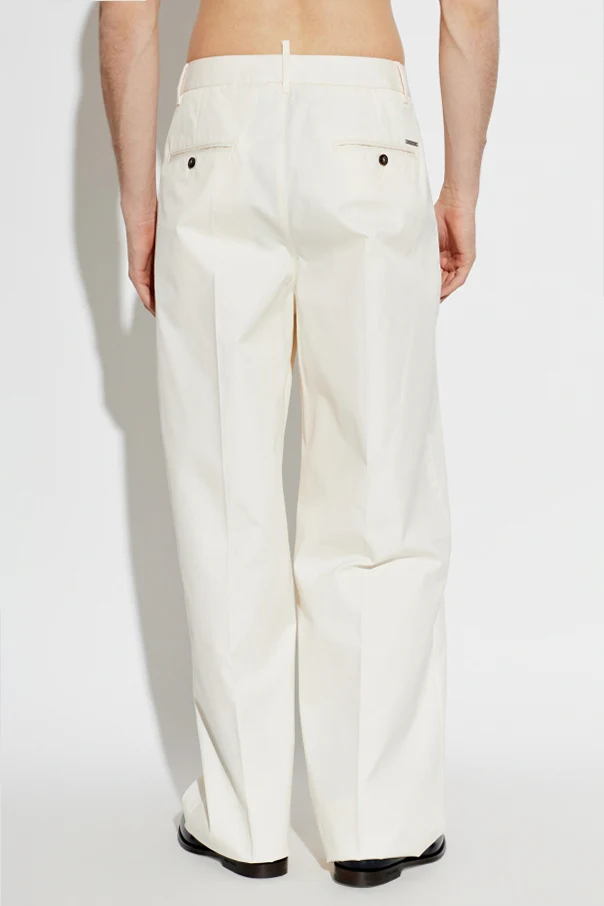 Bawełniane spodnie z szerokimi nogawkami marki Dsquared2 to kwintesencja wytwornego stylu w nowoczesnym wydaniu. Model w odcieniu kremowym zachwyca niebanalnym, szerokim krojem, który podkreśla subtelnie zarysowaną talię oraz dyskretnie zaakcentowany kant, obecny zarówno z przodu, jak i z tyłu nogawek.
