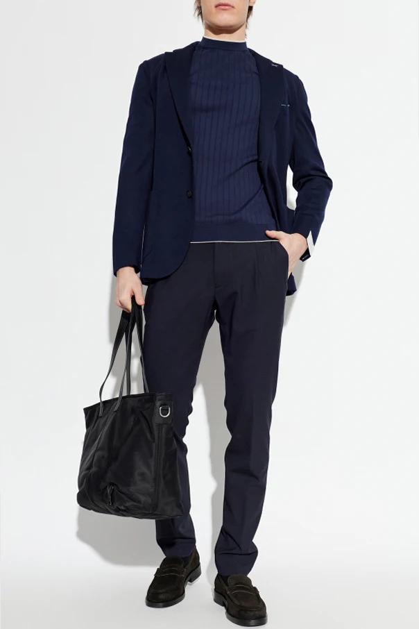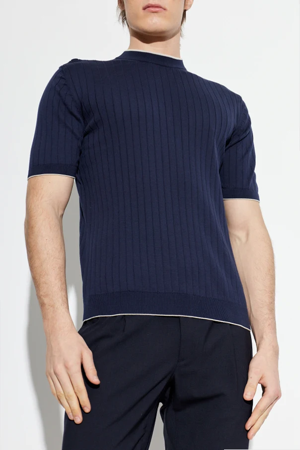 Prążkowany t-shirt z okrągłym dekoltem marki Eleventy to propozycja dla mężczyzn ceniących nieprzeciętną elegancję i nowoczesny styl. Granatowy odcień współgra z klasycznym, prostym krojem, subtelnie dopasowanym do sylwetki, co gwarantuje wyrafinowany wygląd na każdą okazję.