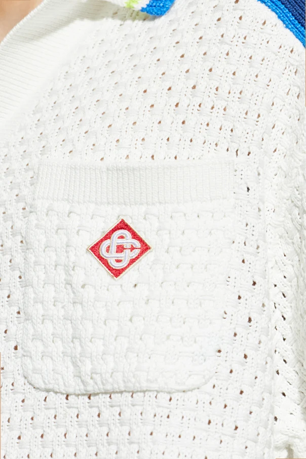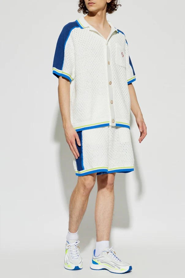 Koszula z krótkimi rękawami od Casablanca to wyrafinowana propozycja dla mężczyzn ceniących subtelną elegancję i sezonową lekkość. Została wykonana z dzierganego, ażurowego materiału o gęstym splocie, który zachwyca nie tylko niepowtarzalną strukturą, ale i perfekcyjną cyrkulacją powietrza. Dominuje nieskazitelny biały kolor, harmonijnie przełamany kontrastowymi detalami w odcieniach niebieskim i limonkowym na rękawach oraz dole, podkreślającymi sportowy charakter koszuli.