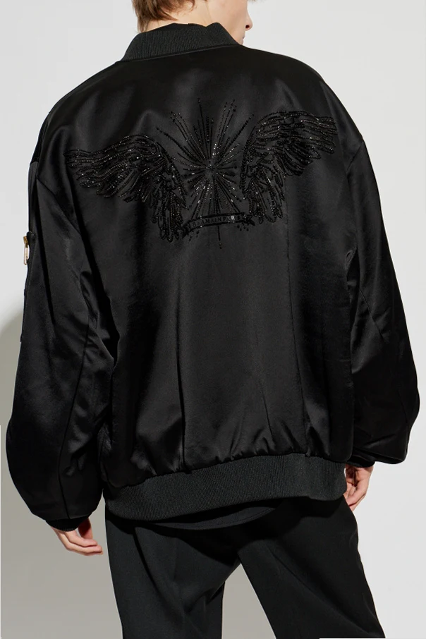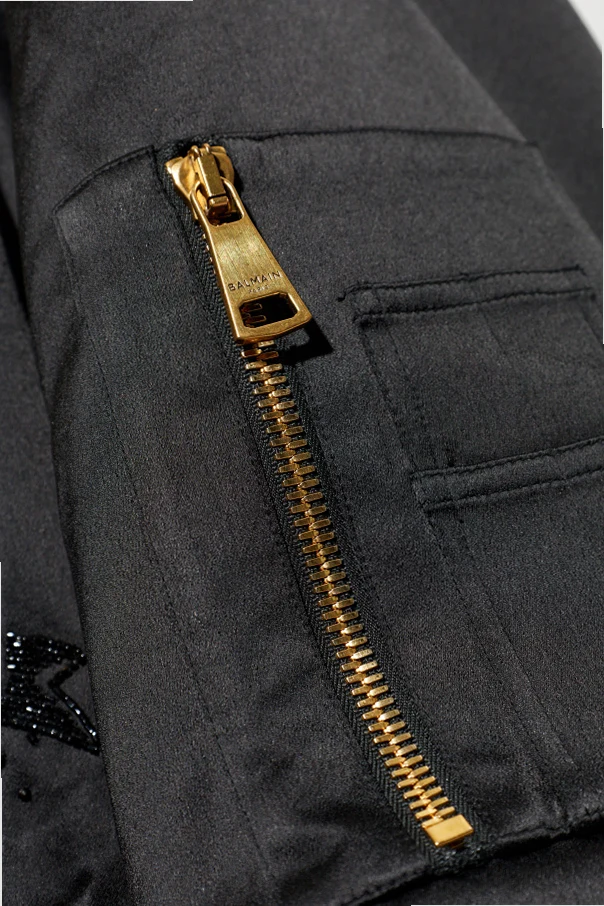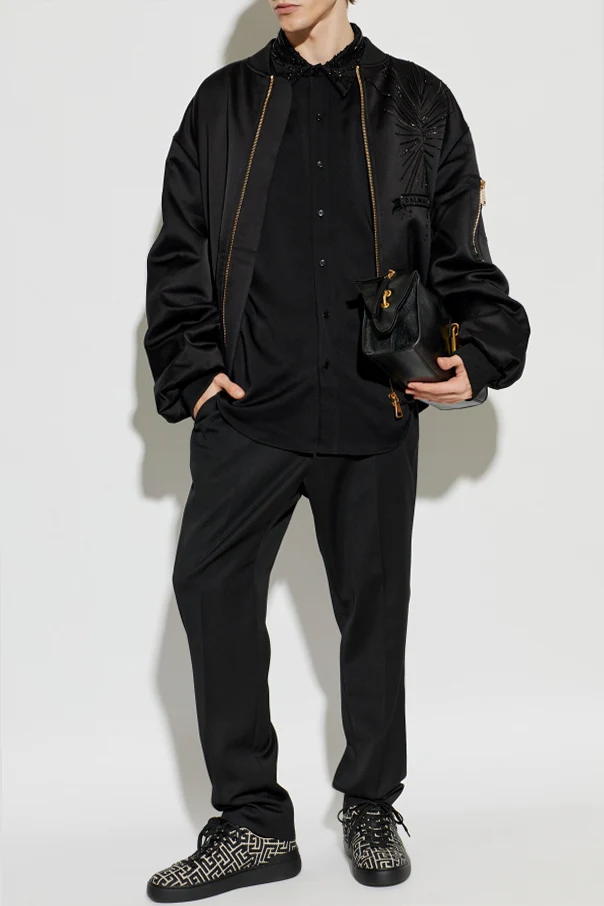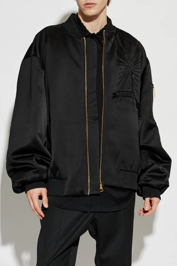 Kurtka typu bomber z połyskującymi aplikacjami autorstwa Balmain stanowi wyraz prawdziwej elegancji we współczesnej odsłonie. Ten klasyczny, delikatnie oversize’owy fason podkreślają szerokie, poszerzane rękawy oraz wyrazisty, gruby ściągacz, które nadają całości lekkość i swobodę.