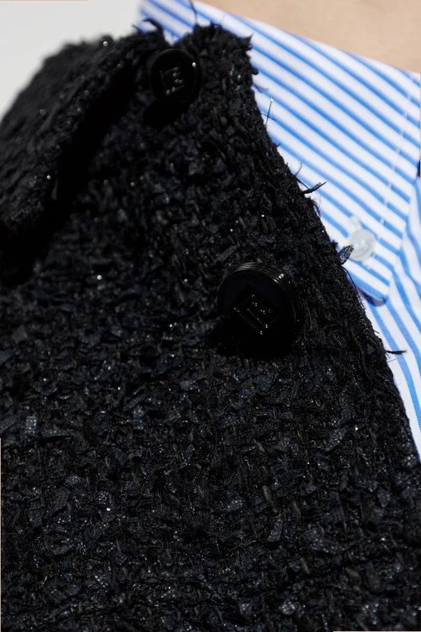 Tweedowa kurtka z lureksową nicią to wyrazistym dziełem domu Balmain, roztaczającym aurę luksusu poprzez wyrafinowaną formę i precyzję wykonania. Starannie dobrany, tweedowy materiał o widocznej strukturze został urozmaicony subtelnym połyskiem lureksowej nici , podkreślającym ekskluzywność tej propozycji. Szlachetna czerń, w której utrzymana jest kurtka, tworzy ponadczasową bazę, stanowiącą symbol dobrego smaku.