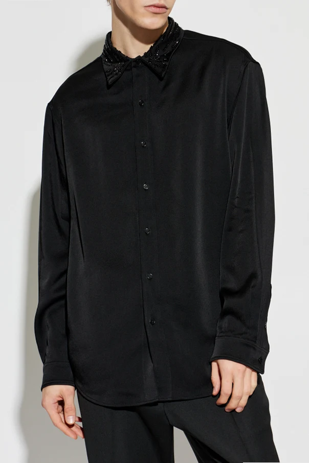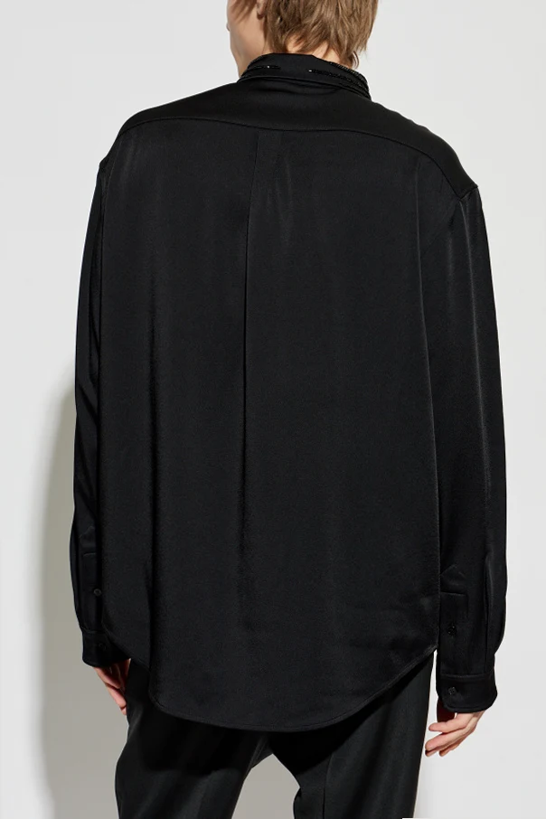 Swobodny, oversizowy krój oraz długie rękawy zakończone mankietami podkreślają ponadczasowy charakter tej czarnej koszuli. Jej wyjątkowym detalem jest ozdobny kołnierz, misternie zdobiony lśniącymi cekinami i koralikami, który przyciąga wzrok, dodając całości niepowtarzalnej wytworności. Czarny kolor koszuli doskonale dopełniają eleganckie, jednolite guziki.