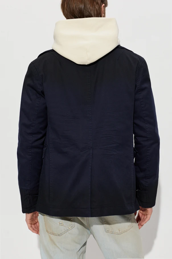 Gładka, jednolita faktura granatowego materiału – będącego szlachetną mieszanką bawełny i elastanu – oferuje matowe wykończenie, odporność na zagniecenia oraz subtelną sztywność. Dwa rzędy dużych, ozdobnych guzików z dyskretnym motywem nadają mu wyjątkowego charakteru, a praktyczne duże kieszenie z patkami oraz kieszeń na piersi dopełniają kompozycji funkcjonalnych detali.