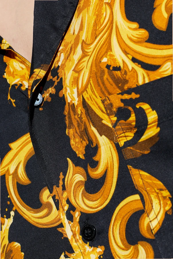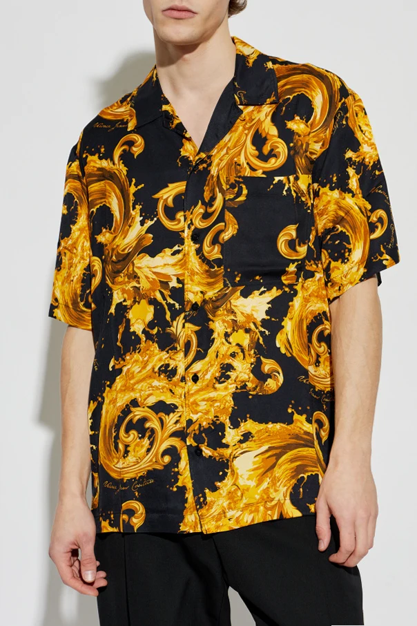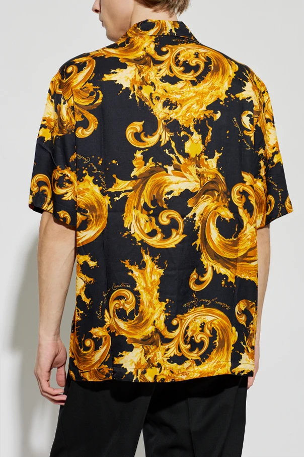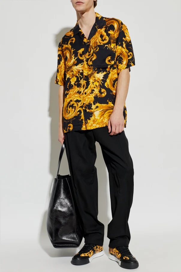 Koszula ze wzorem barocco marki Versace Jeans Couture stanowi wyraz uwielbienia dla luksusu oraz mistrzostwa krawieckiego. Wykonana w całości z najwyższej jakości wiskozy, zachwyca wyraźnie gładką strukturą, otulając sylwetkę miękkością i lekkością noszenia. Klasyczny, luźny krój typu casual oraz przód zapinany na guziki zapewniają ponadczasową elegancję, zaś czarny kolor tła doskonale współgra z dużymi, spiralnymi ornamentami w odcieniach złota typowych dla stylu „barocco”.