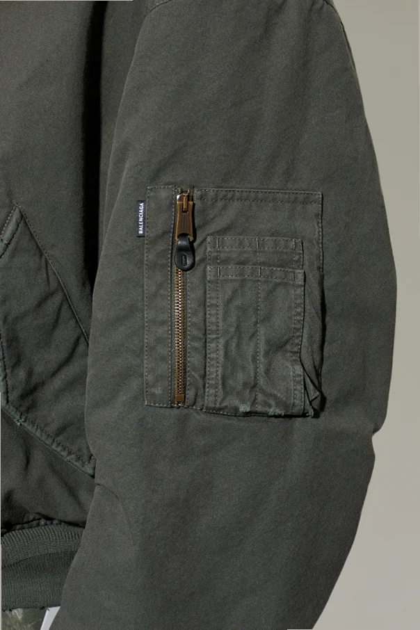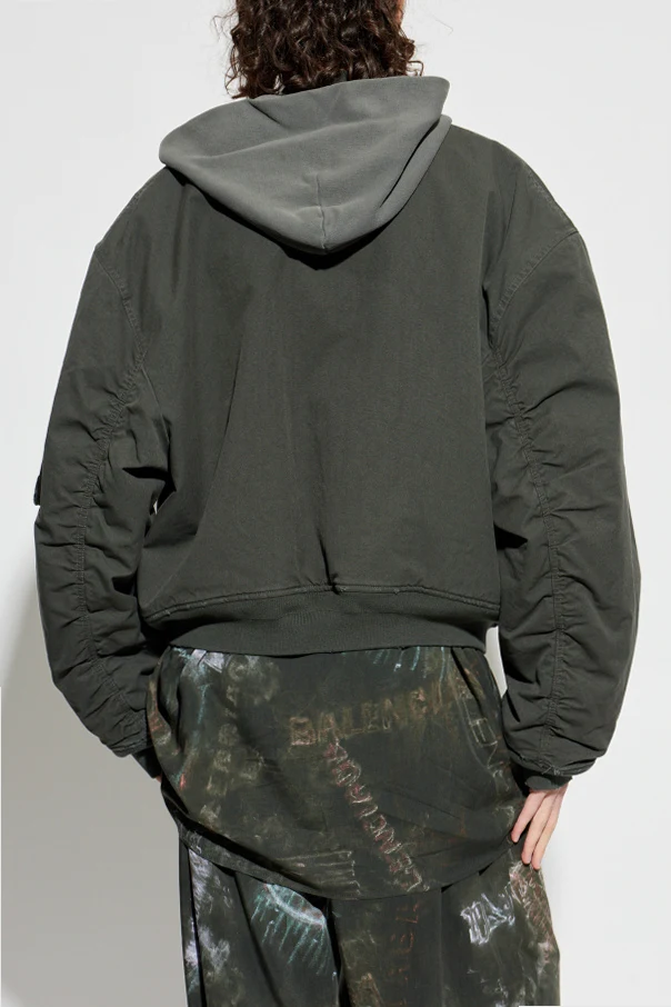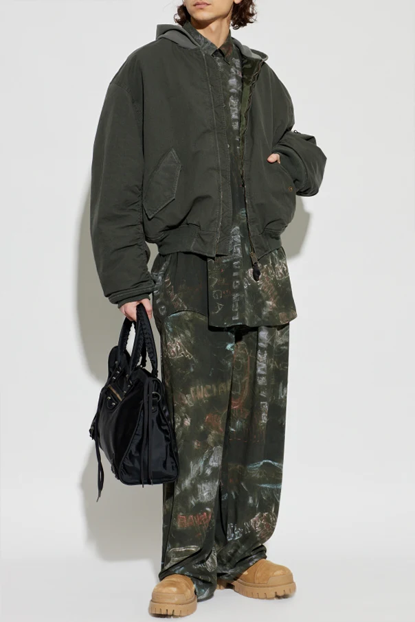 Ocieplana kurtka z kapturem marki Balenciaga zachwyca subtelną estetyką, podkreślając ponadczasowy, męski styl. Utrzymana w szlachetnej, zielonej tonacji, urzeka gładką powierzchnią oraz klasycznym fasonem bomberki z wyraźnie zarysowaną objętościową sylwetką. Kurtka została stworzona z wytrzymałej bawełny technicznej w mieszance z poliamidem, z dodatkiem ocieplającej podszewki oraz unikatowym wypełnieniem bazującym na jedwabiu i polilaktydzie.