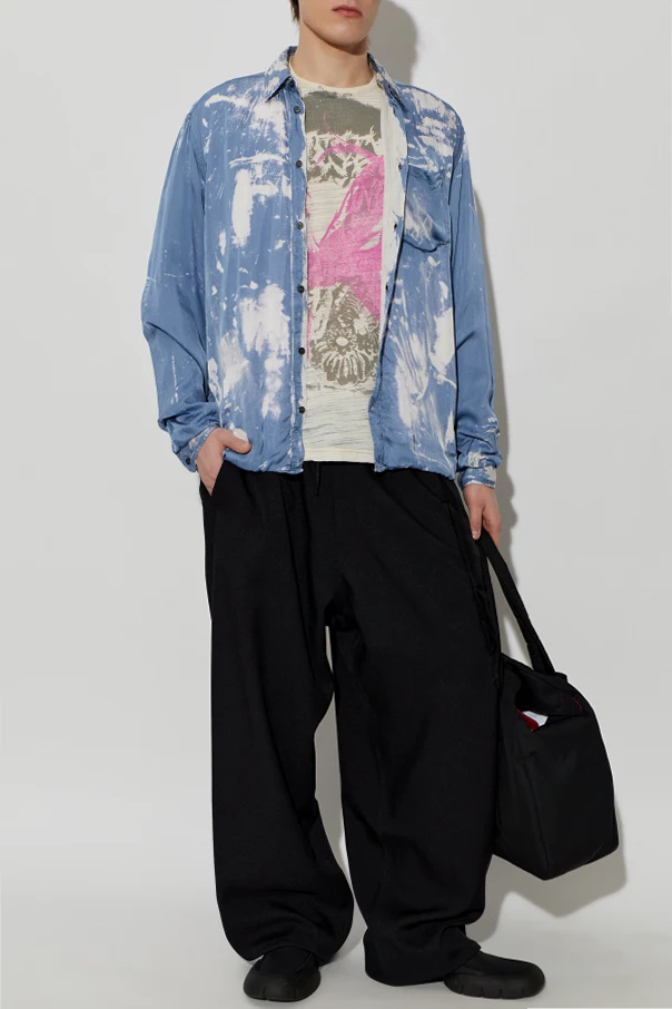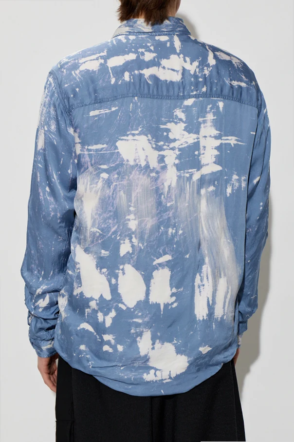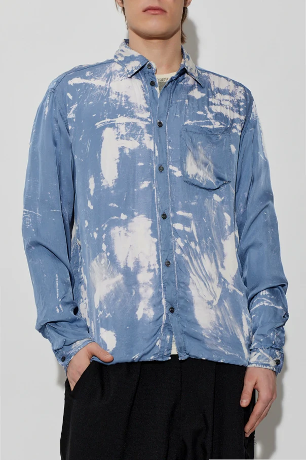 Niebieska powierzchnia koszuli, wzbogacona nieregularnymi, białymi plamami, tworzy niezwykle oryginalny efekt „odbarwienia”, nadając każdemu egzemplarzowi indywidualnego charakteru. Asymetryczny wzór pokrywa zarówno przód, jak i tył oraz klasyczną kieszeń na lewej piersi. Prosty krój, długie rękawy zakończone mankietami oraz kontrastujące ciemne guziki dodają całości elegancji w nowoczesnym wydaniu.