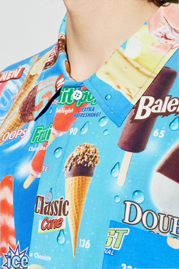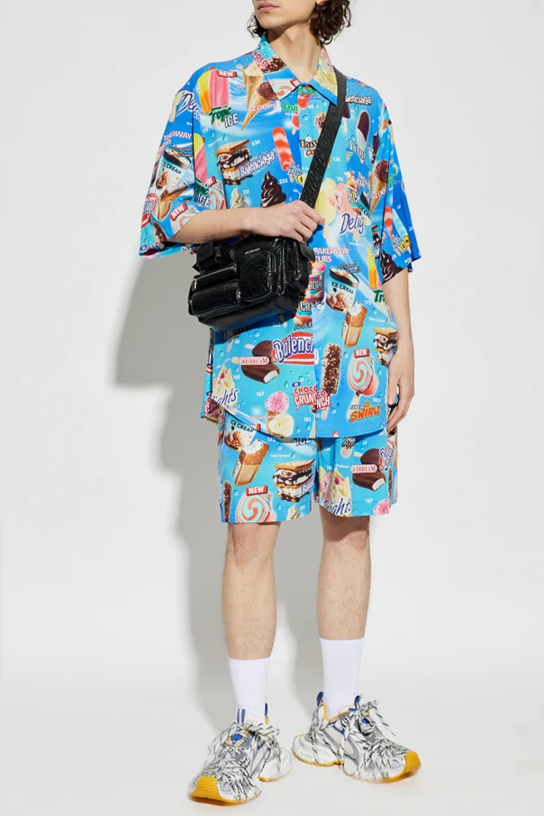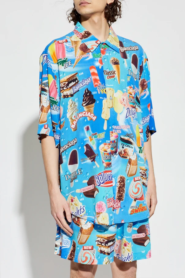 Koszula z nadrukiem marki Balenciaga to propozycja dla koneserów wyszukanej elegancji i wyrafinowanego stylu miejskiego. Wyróżnia się klasycznym, choć luźnym krojem oversize z prostymi rękawami do łokcia oraz zaokrąglonym dołem, zapewniającymi komfort i swobodę ruchów.