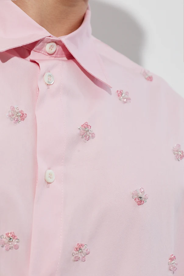 Koszula z połyskującymi aplikacjami to propozycja dla nowoczesnego mężczyzny ceniącego kunszt i indywidualizm. Jej różowy odcień harmonijnie współgra z subtelnym połyskiem regularnie rozmieszczonych aplikacji roślinnych, misternie wykonanych z drobnych koralików i kryształków w odcieniach różu oraz zieleni.