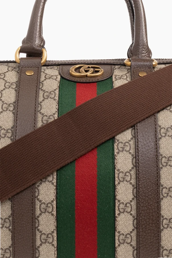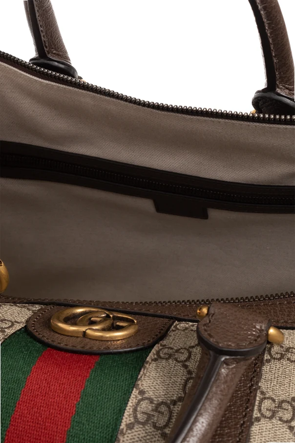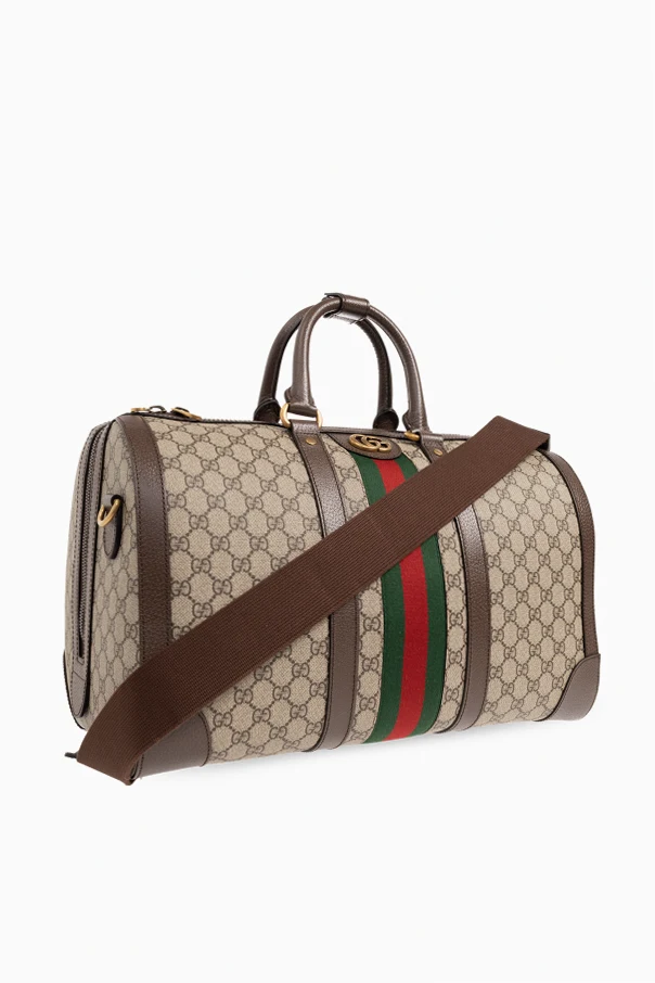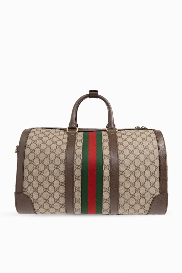 Beżowo-brązowa torba podręczna, model ‘Savoy Small’ Gucci. Wykonana z charakterystycznego dla marki płótna ‘GG Supreme’ i wykończona skórą cielęcą. Zamykana na dwubiegunowy zamek. Ozdobiona pasem z motywem ‘Web’ w kolorze zielono-czerwono-zielonym. Dołączona zawieszka z nadrukiem w kolorze złotym oraz z chowanym kluczykiem i kłódką. Dwie półokrągłe rączki łączone zatrzaskiem. Odpinany pas na ramię z możliwością regulacji długości. Wewnątrz komora z dwoma kieszeniami zamykanymi na zamek. Metalowe wykończenie w kolorze złotym.