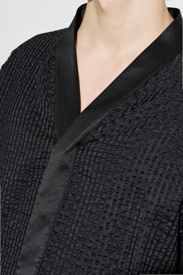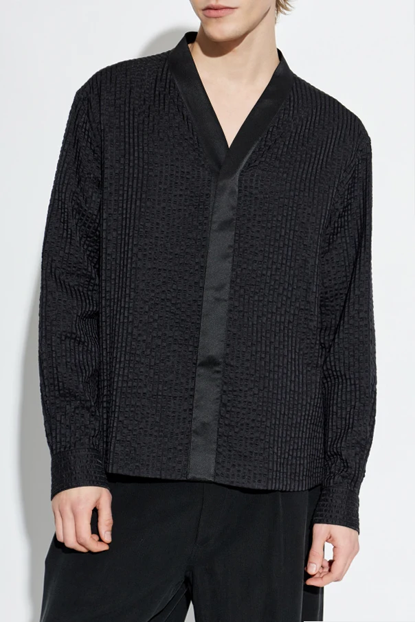Koszula o satynowym wykończeniu marki Giorgio Armani stanowi kwintesencję wyrafinowanego stylu, dedykowaną mężczyznom, którzy cenią subtelną elegancję. Łączy nowoczesny, minimalistyczny krój z inspiracją klasyczną — prosty, nieco luźny fason, długie rękawy i szalowy kołnierz typu kimono, który pięknie wydłuża linię szyi.