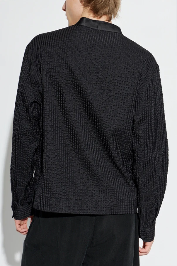 Uszyta z unikatowej tkaniny o tłoczonym geometrycznym wzorze , koszula wyróżnia się czarnym kolorem oraz subtelnym połyskiem satynowej plisy i kołnierza. Brak widocznych guzików na froncie podkreśla minimalistyczny charakter projektu, a harmonijne zestawienie matowych i błyszczących powierzchni buduje wyrafinowaną strukturę.