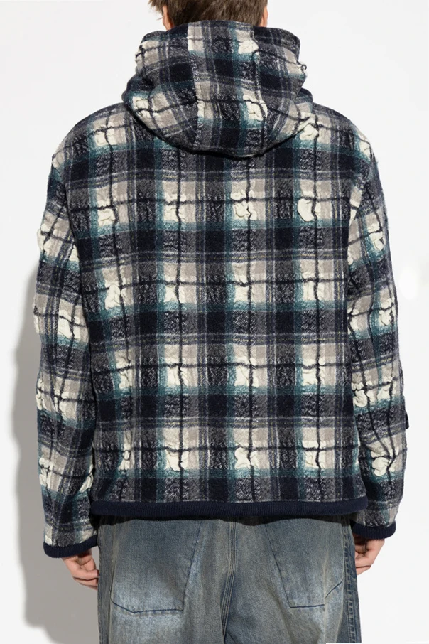 Kurtka z kieszenią autorstwa Loewe łączy wyrafinowaną prostotę klasycznego kroju z niepowtarzalną estetyką wzoru. Dominuje kratka w tonacjach granatu, bieli, delikatnych szarości oraz akcentów zieleni, nadająca całości nieco artystyczny wyraz. Ocieplana, wykonana z grubej tkaniny, zachwyca szlachetnością warstwy zewnętrznej, w której odnaleźć można len, wełnę, kaszmir oraz wiskozę i poliamid.