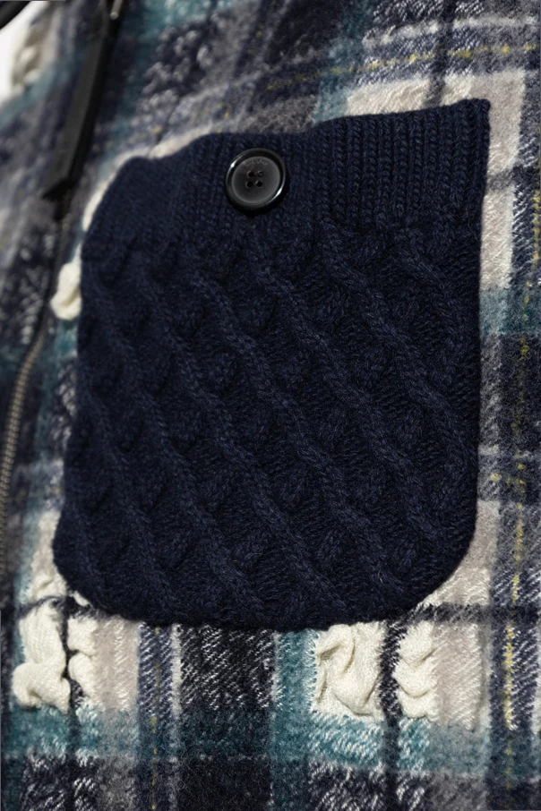 Wyjątkowym detalem jest pojedyncza, granatowa kieszeń na piersi, wykonana z dzianiny o wyrazistym splocie rombowym, zamykana na elegancki guzik. Kurtka, osadzona swobodnie na barkach, subtelnie podkreśla naturalny ruch.