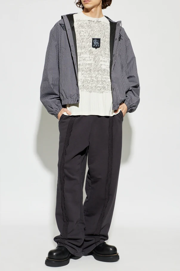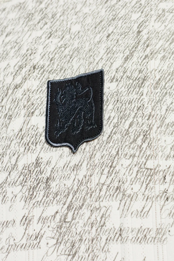 Kremowa dzianina o wyraźnej strukturze pionowych pasków zachwyca delikatnością i wyjątkową jakością. Wielkoformatowy, kaligraficzny nadruk w odcieniu szarości intryguje, nie dominując całości projektu. Uwagę przykuwa czarna naszywka w formie tarczy z haftowanym motywem – wyrafinowany detal świadczący o nieprzeciętności tej koszulki.