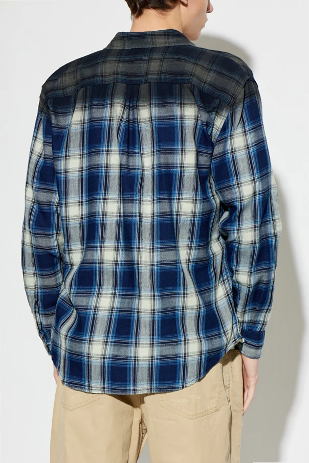 Wyrazisty wzór w kratę łączy głębokie odcienie niebieskiego, czerni, bieli oraz delikatne beżowe akcenty, tworząc unikatowy charakter koszuli. Dwie symetryczne kieszenie na piersi, wyposażone w patki zapinane na guziki, gwarantują praktyczność oraz eleganckie wykończenie. Oryginalność produktu podkreśla prostokątne logo projektanta, umieszczone stylowo na czerwonej metce przy lewej kieszonce.