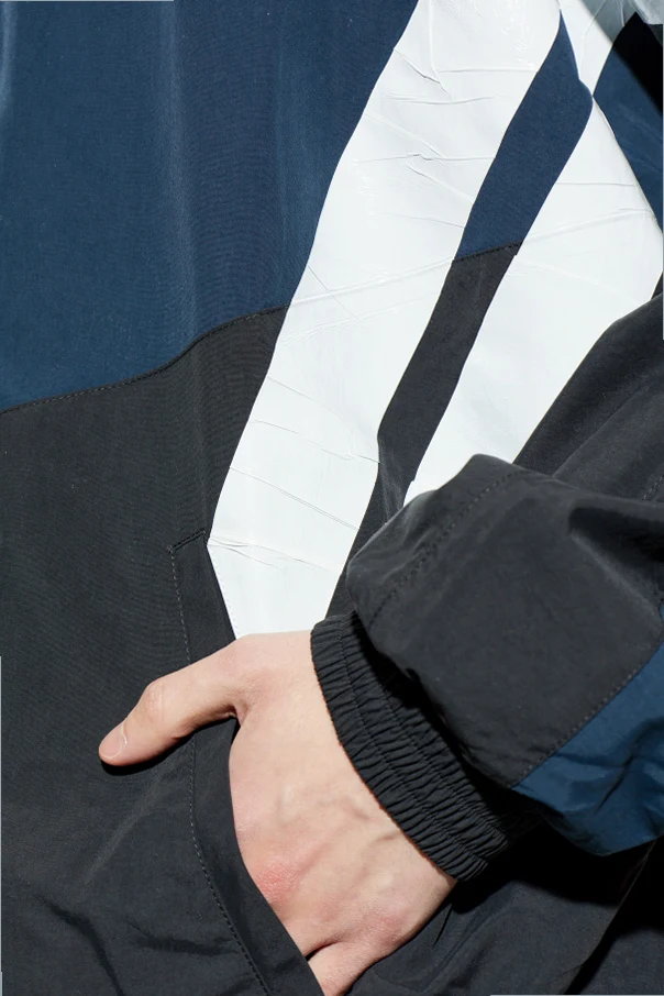 Kurtkę wyróżnia czarny kolor , który został przełamany dynamicznymi, geometrycznymi panelami w odcieniach bieli i szaroniebieskiego granatu. Efektowne, szerokie paski na rękawach podkreślają sportowy, a jednocześnie wysublimowany charakter całości. Lśniący, lekki materiał syntetyczny nadaje całości nowoczesnego wyrazu i subtelnej elegancji.