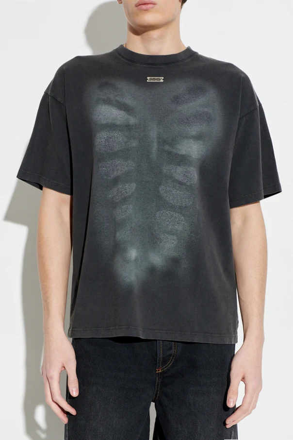 Uwagę przyciąga czarny kolor tła, stanowiący szlachetne tło dla centralnie umieszczonego, intrygującego nadruku o rentgenowskim motywie żeber. Ten wyrazisty wzór podkreśla charakter koszulki, czyniąc ją odważnym akcentem w każdej męskiej garderobie.