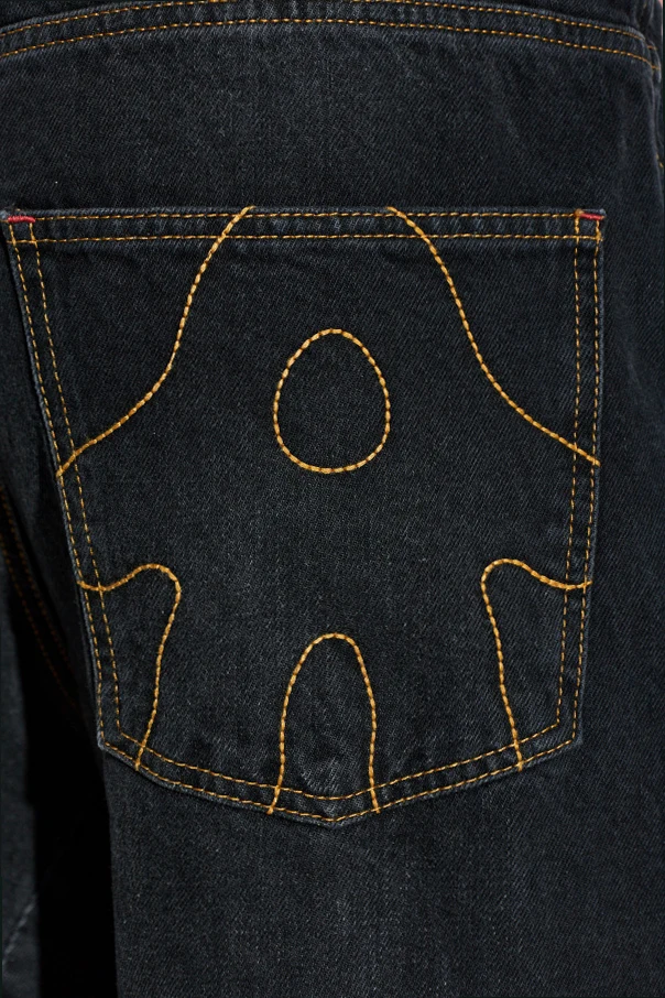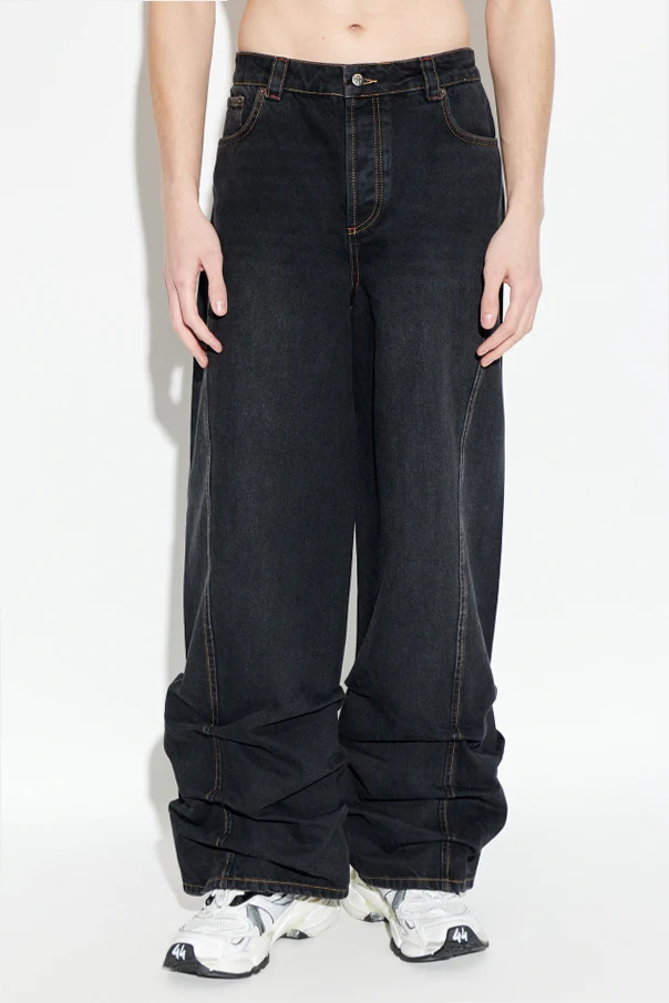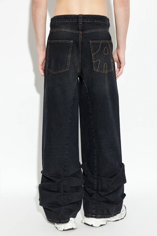Ich czarny , gładki denim wyróżnia się subtelnością, a jedyną dekoracją jest efektowny, abstrakcyjny haft w kolorze żółto-pomarańczowym na tylnej kieszeni, stanowiący unikatowy akcent. Szerokie, wyraziste nogawki z nadmiarem długości pięknie marszczą się przy kostkach, podkreślając geometryczny, awangardowy charakter projektu. Całość dopełniają kontrastujące szwy wydobywające kunszt krawiectwa.