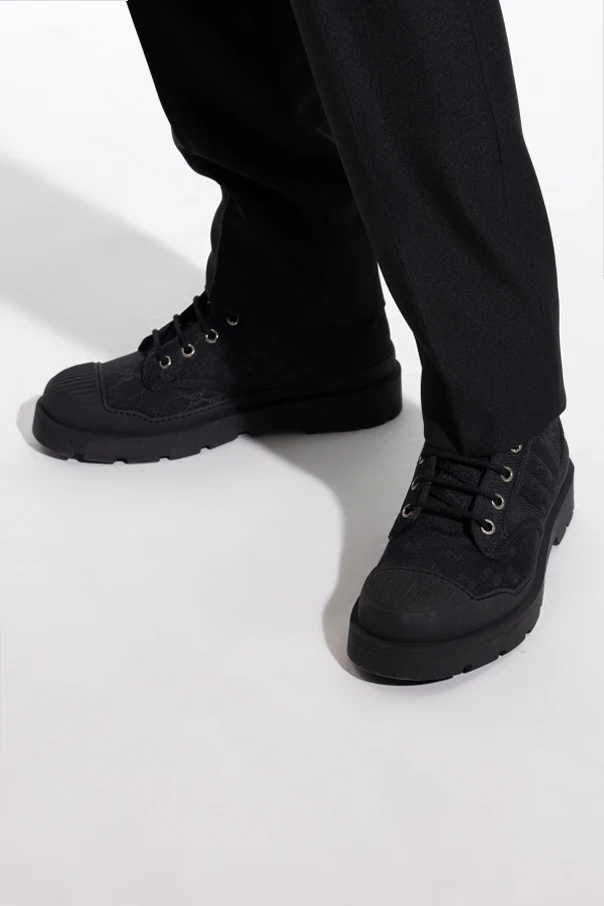 Buty posiadają masywną podeszwę z wyraźnym bieżnikiem, co zapewnia stabilność i komfort noszenia. Sznurówki z metalowymi oczkami dodają im wyrazistości, a subtelne logo projektanta podkreśla ich ekskluzywność.