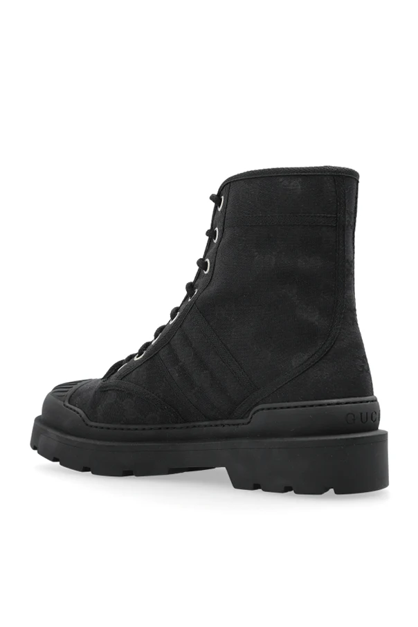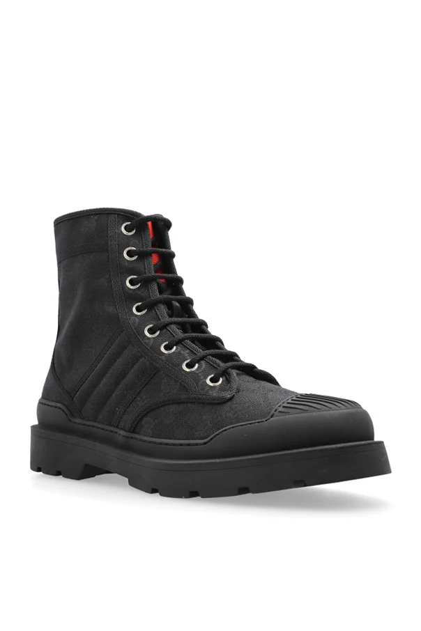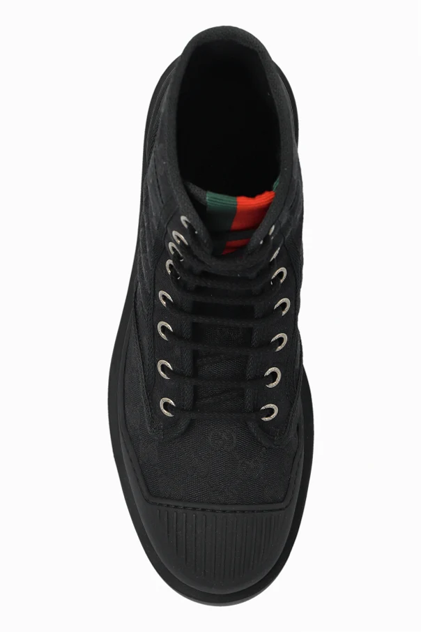 Te czarne sneakersy wyróżniają się klasycznym kształtem wysokich butów, sięgających za kostkę. Wykonane z materiału tekstylnego oraz skóry, ozdobione delikatnym wzorem monogramu, podkreślają luksusowy charakter marki. Detale w kolorach zielonym i czerwonym, widoczne wewnątrz języka, nawiązują do charakterystycznych barw Gucci.