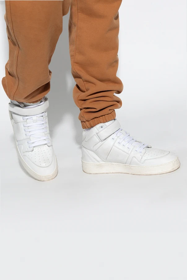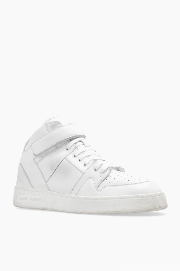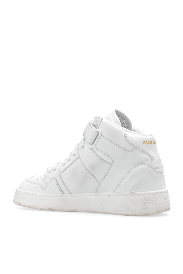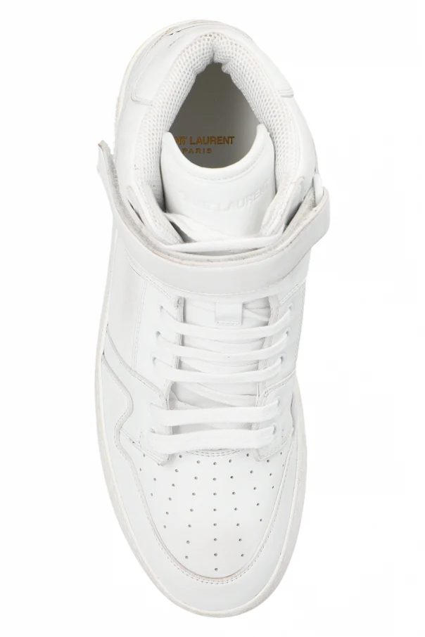 Białe, sznurowane buty sportowe za kostkę, model ‘Lax’ Saint Laurent. Wykonane z cielęcej skóry. Dodatkowo zapinane na rzep. Z przodu perforacje. Na języku wytłoczone logo. Z tyłu nadrukowane logo w kolorze złotym. Biała, gumowa podeszwa. Efekt ‘vintage’. Dołączone wymienne sznurowadła.