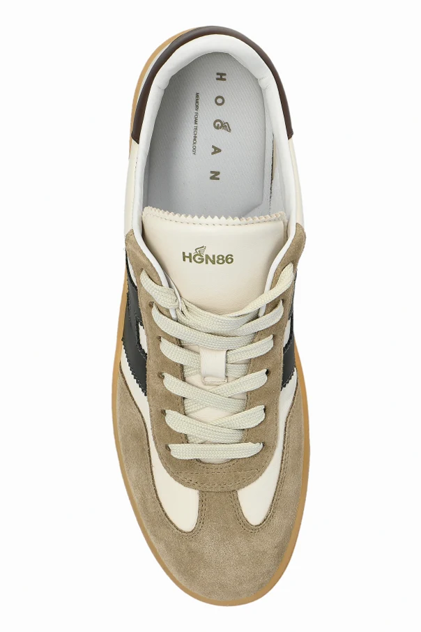 Buty sportowe Cool marki Hogan emanują wyrafinowaną elegancją, będąc synonimem komfortu i wyszukanego stylu. Harmonijne połączenie kremowej skóry z beżowym zamszem nadaje im niepowtarzalny, nowoczesny charakter, podkreślony wyraźnymi, kontrastowymi elementami. Uwagę przykuwa majestatyczna, czarna litera „H” zdobiąca boki, subtelnie eksponując prestiż projektanta.