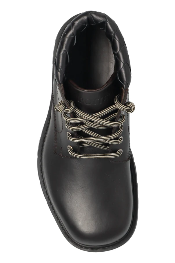 Wyjątkową wygodę zapewnia miękko wyściełany kołnierz, zaakcentowany unikatowym przeszyciem w motywie plecionki. Gładka, matowa skóra naturalna o jednolitej fakturze podkreśla ekskluzywny charakter, a subtelny kontrast jasnoszarych sznurowadeł oraz metalowych oczek wnosi nowoczesny akcent. Całość tworzy wyważony dialog między tradycją a innowacją, będący znakiem firmowym włoskiego domu mody.