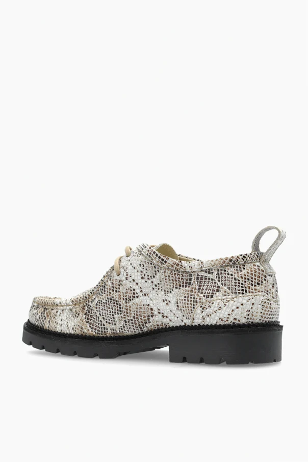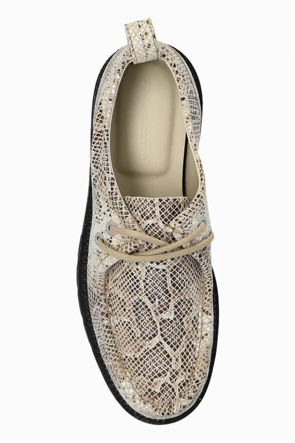 Wierzch pokryty jest wzorem imitującym skórę egzotyczną w tonalnych odcieniach kremowym – z przewagą tej barwy. Szlachetną materię stanowi naturalna skóra, zarówno na zewnątrz, jak i wewnątrz buta. Z tyłu umieszczono praktyczną szlufkę usprawniającą zakładanie, a kremowe okrągłe sznurowadła dopełniają harmonii całości.
