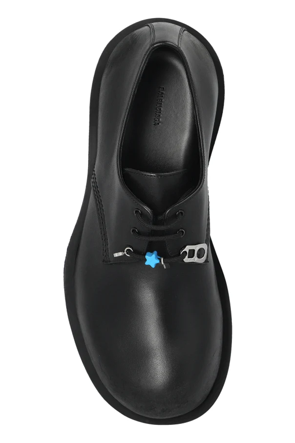 Klasyczne sznurowanie z czterema przelotkami, subtelny metalowy akcent oraz niebieska ozdoba w kształcie gwiazdki stanowią dyskretne, lecz wyrafinowane uzupełnienie całości. Na wkładce widoczny jest napis z nazwą projektanta.