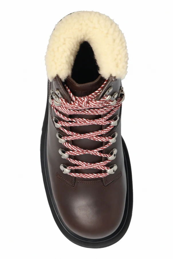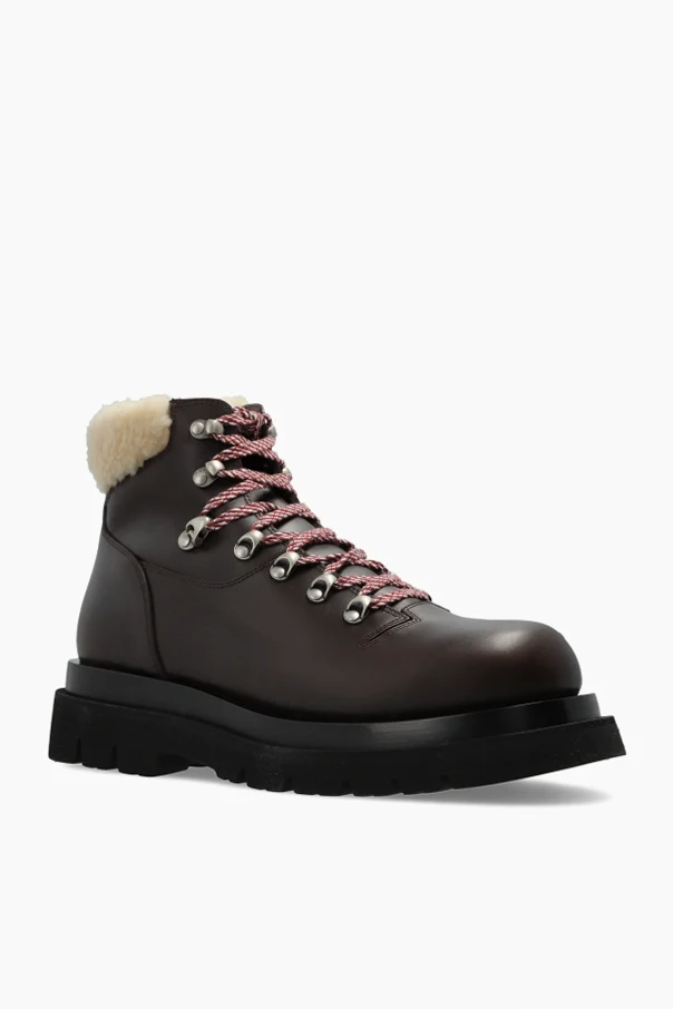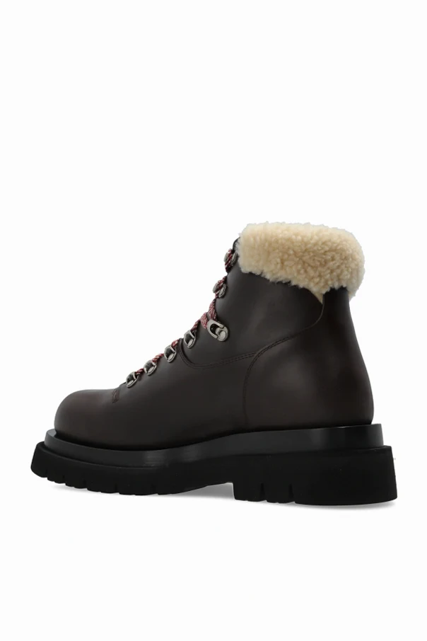 Buty za kostkę ‘Lug’ marki Bottega Veneta to kwintesencja wyrafinowanego rzemiosła. Utrzymane w szlachetnym, brązowym kolorze, wyróżniają się harmonijną sylwetką nawiązującą do klasyki obuwia trekkingowego. Gładka cholewka ze skóry naturalnej oraz ocieplane, kremowe futerko dyskretnie wyłaniające się z brzegów cholewki akcentują luksusowy charakter produktu.