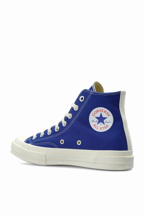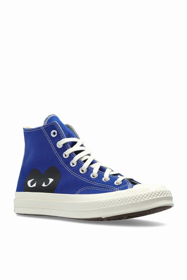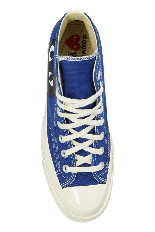 Charakterystycznym akcentem jest nadruk serca z oczami Comme des Garçons Play na zewnętrznej stronie, oraz tradycyjny emblemat Converse All Star od wewnątrz. Obuwie osadzone jest na solidnej, białej gumowej podeszwie z czarną linią oraz wyposażone w wygodne białe sznurówki i metalowe oczka.