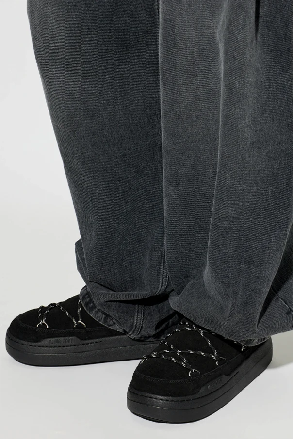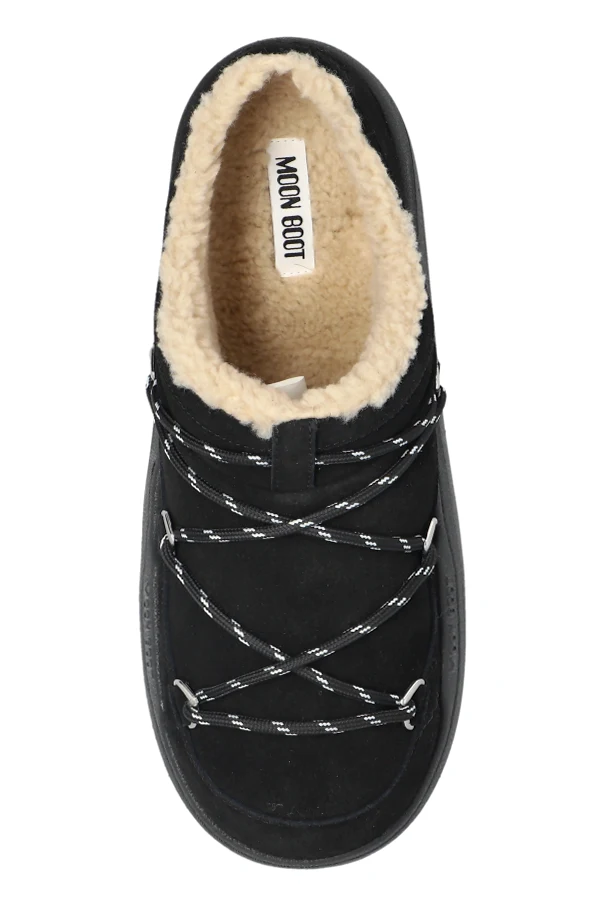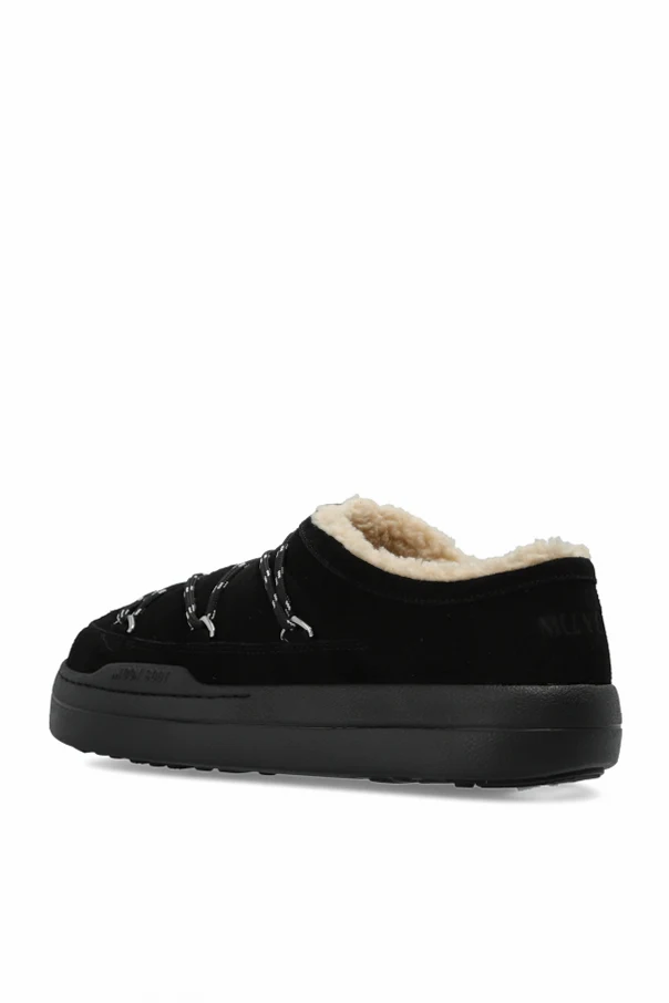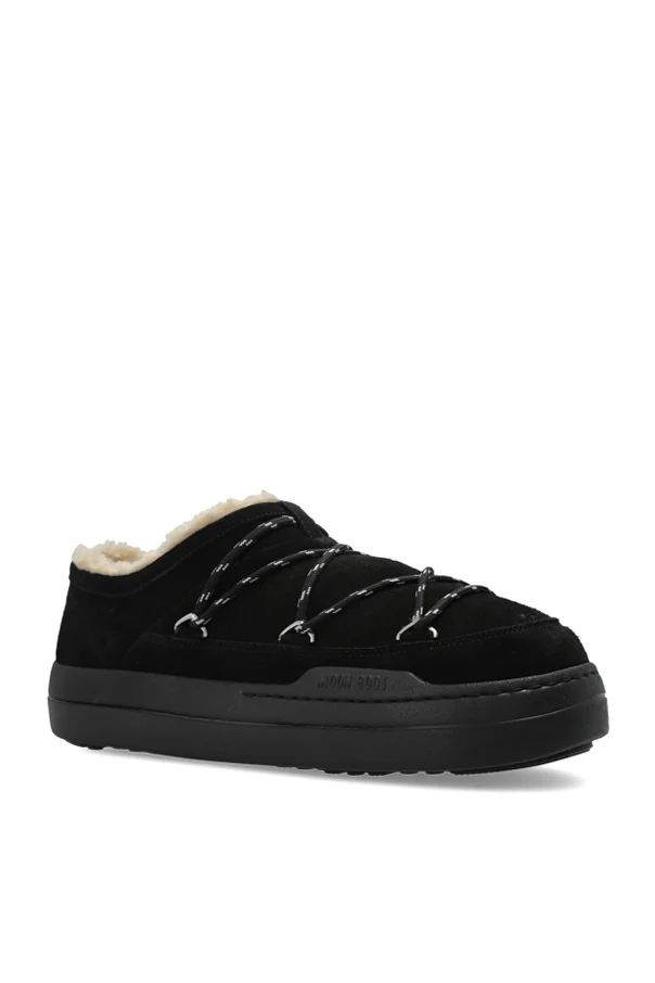 Buty ‘MB PARK SLIPPER’ marki Moon Boot to kwintesencja miejskiej elegancji połączonej z komfortem użytkowania. Model wsuwany, o szerokiej sylwetce i solidnej, masywnej podeszwie inspirowanej obuwiem śniegowym, wyróżnia się czarną cholewką wykonaną z ekskluzywnego zamszu lub nubuku oraz jasnym, miękkim futerkiem syntetycznym, które subtelnie wywija się na krawędzi, zapewniając ciepło i wygodę o każdej porze roku.