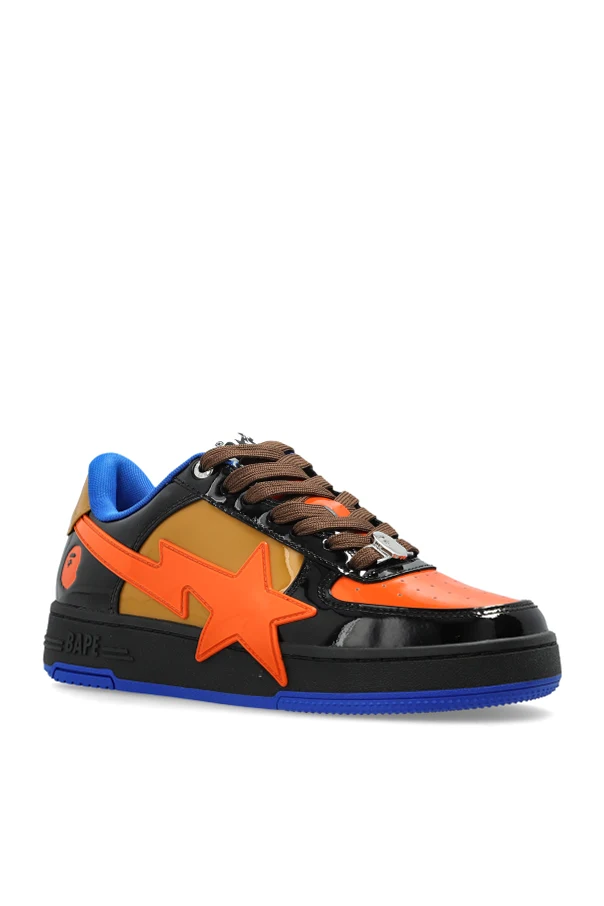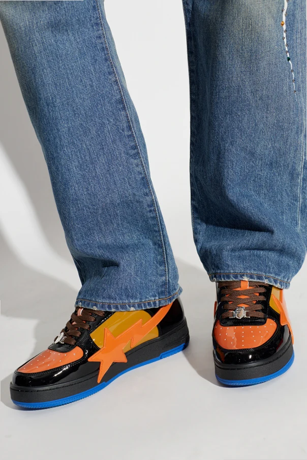 Buty sportowe z logo marki A BATHING APE® to propozycja dla koneserów wyszukanej estetyki i bezkompromisowej jakości. Ten klasyczny fason sneakersów typu low-top o łagodnie zaokrąglonym przodzie i subtelnym profilu czaruje wielowymiarową, multikolorową paletą barw, wśród których przenikają się odcienie pomarańczowego, czerni, oliwki oraz brązu, wzbogacone o dynamiczne akcenty jaskrawego błękitu i pomarańczową gwiazdę po bokach.
