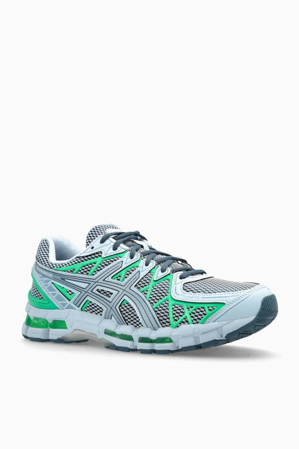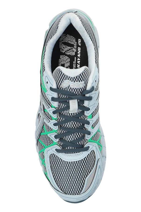 Wyjątkową cechą jest solidna podeszwa z efektownymi, zielonymi akcentami GEL oraz dynamiczne, geometryczne wzory na bokach. Rozpoznawalne paski ASICS oraz napisy „GEL-KAYANO 20” podkreślają renomę i autentyczność produktu.