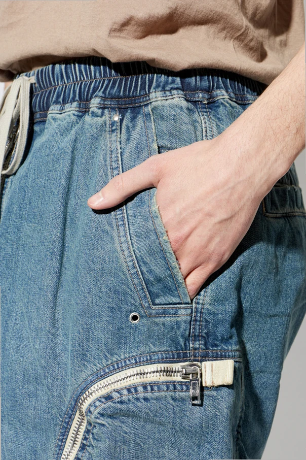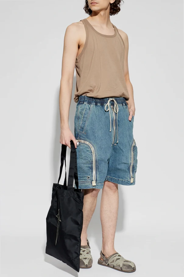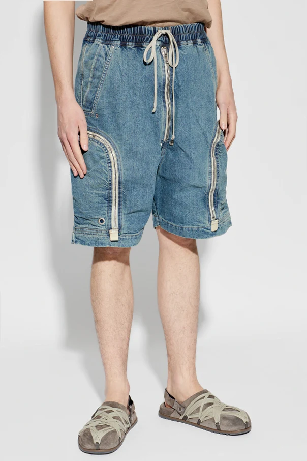 Luźny, regularny krój sięgający kolan zapewnia swobodę ruchów, a charakterystyczne, pojemne kieszenie cargo, zamykane na niezwykle dekoracyjne, białe zamki błyskawiczne w łukowatym przebiegu, przyciągają spojrzenie i podkreślają designerski sznyt projektu. Elastyczny pas ze ściągaczem w granatowo-białą prążkowaną gumę oraz długi, biały sznurek umożliwiają indywidualną regulację. Szorty zostały zaprojektowane przez Rick Owens DRKSHDW, co gwarantuje nietuzinkową estetykę i bezkompromisową jakość.