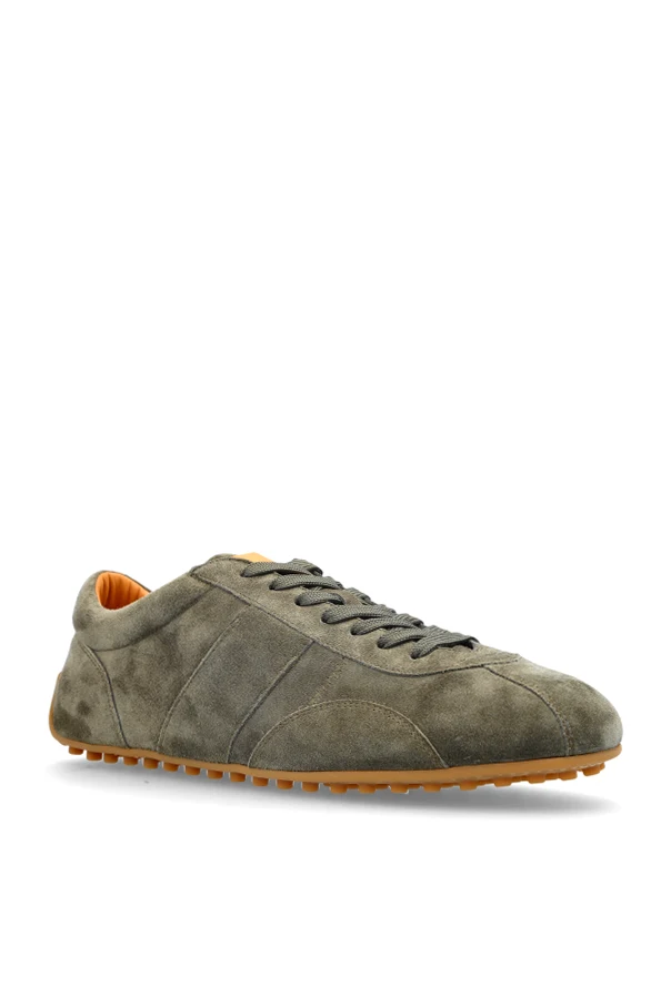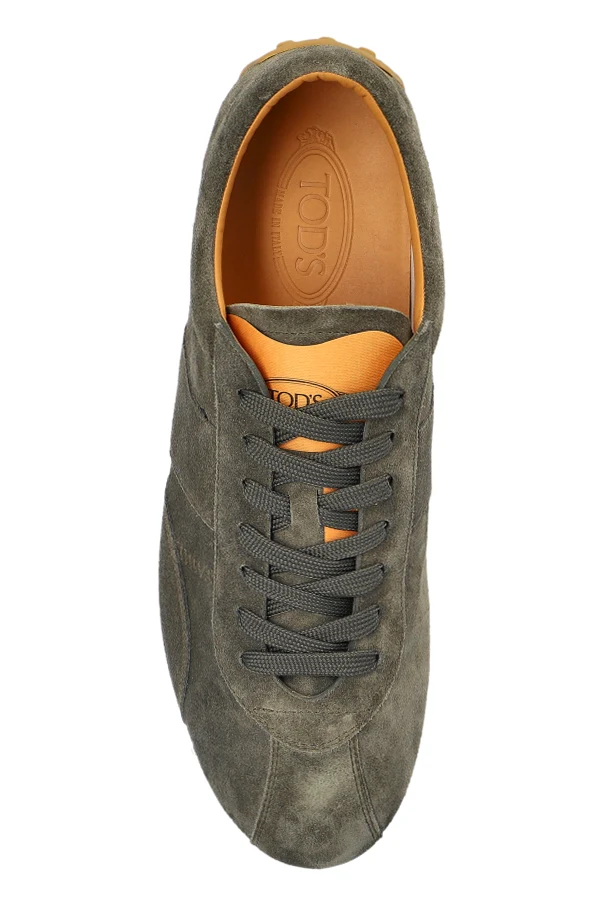 Zamszowe buty sportowe T-Marathon od Tod’s to kwintesencja klasycznej elegancji ujętej w sportowej formie. Niski profil i smukła sylwetka z zaokrąglonym przodem zachwycają minimalistyczną, lekko retro linią nawiązującą do najlepszych tradycji obuwia biegowego. Starannie wykonana cholewka z miękkiego zamszu w odcieniu zielonym została podkreślona subtelną, geometryczną strukturą przeszyć, zapewniającą wyrafinowany wygląd.