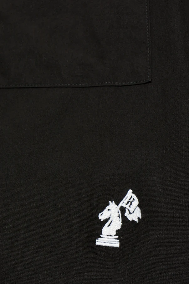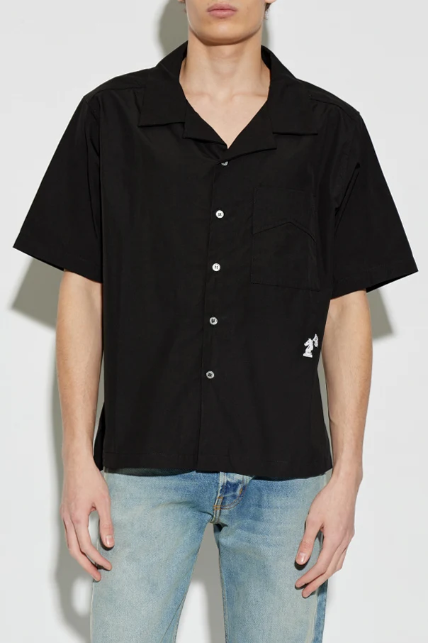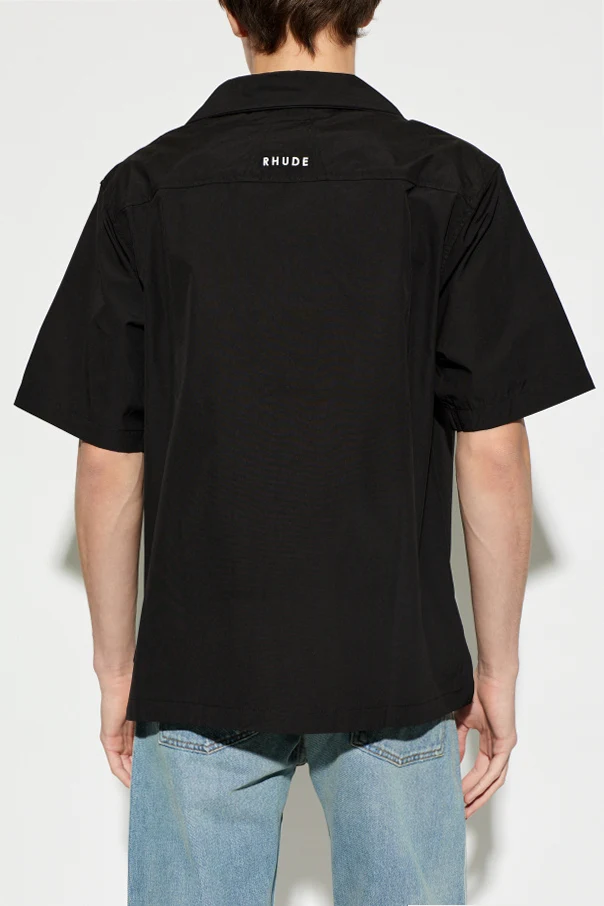 Uszyta z wysokogatunkowej bawełny koszula w dominującym czarnym kolorze zachwyca gładką fakturą materiału. Kontrastujące białe guziki dodają całości wyrazistości, a szlachetne detale – haftowana biała aplikacja szachowego konia z chorągiewką oraz subtelny napis „RHUDE” na karku – podkreślają jej unikatowy charakter i prestiż marki.